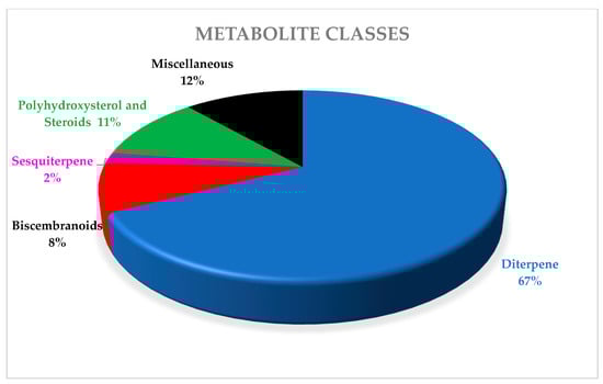 Pie chart showing the percentage of each class of metabolites identified in Sarcophyton sp.
