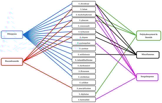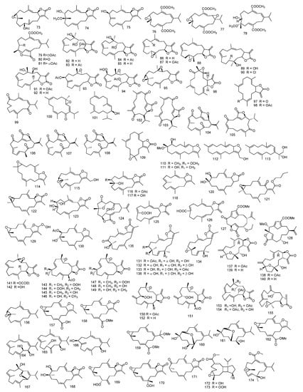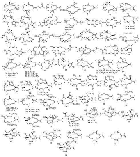 Investigation of ethyl acetate extract of S. crassocaule yielded six polyoxygenated cembrane-diterpenoids with a trans-fused α-methylene-γ-lactone, identified as crassocolides A–F 82–87 alongside lobophytolide 88. Absolute configuration for crassocolide A 82 was resolved by using modified Mosher’s method [46]. Another seven polyoxygenated cembranoids with α-methylene-γ-lactone group identified as crassocolides G–M 89–95, were reported. The structures of all compounds were determined through a full spectral data analysis, and the absolute configuration of crassocolide G 89 was investigated by modified reaction of Mosher’s assay [47]. Other crassocolides N–P 96–98 were isolated from S. crassocaule [48]. The CHCl3/MeOH extract of S. flexuosum yielded three cembranes, identified through spectral data as flexusines A, B, and epimukulol 99–101 [49].