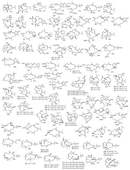2-epi-sarcophine 203 and (1R,2E,4S,6E,8R,11R,12R)-2,6-cembradiene-4,8,11,12-tetrol 204, two diterpenes were isolated from S. auritum [75]. An extensive chemical investigation of Sarcophyton sp. extract yielded four cembranoids, sarcophytons A–D 205–208, along with cembranoids, 2-[(E,E,E)-7′,8′-epoxy-4′,8′,12′-trimethylcyclotetradeca-1′,3′,11-trienyl]propan-2-ol 209, (1E,3E,7R*,8R*,11E)-1-(2-methoxy-propan-2-yl)-4,8,12-trimethyloxabicyclo[12.1.0]-pentadeca-1,3,11-triene 210, crassumol C 211, and laevigatol A 212. [76]. Two unique pyrane-based cembranoids, sarcotrocheliol acetate and sarcotrocheliol 213 and 214 were isolated from S. trocheliophorum [77]. Investigation of S. glaucum organic extract resulted in the isolation of sarcophinediol 215, previously processed semi-syntheticaly [78].