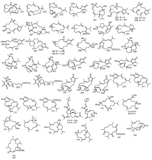 Three cembranoids from S. trocheliophorum, sarcophytrols D–F 259–261 highly oxidative compounds, besides, 11,12-epoxy-1(E),3(E), 7(E)-cembratrien-15-ol 262 and sinugibberol 263 were isolated. All structures were investigated by a full spectral data and by comparing with previous stated data [86]. Another six cembranoids, sarcophytrols G–L 264–269 together with crassumol A 270, were isolated from S. trocheliophorum [87]. Additionally, another nine cembranoids, sarcophytrols M–U 271–279, were also reported. Their structures were interpreted with extensive spectral analysis and chemical conversion and the absolute configuration for sarcophytrols M–S 271–277 were investigated by the modified Mosher’s assay. Sarcophytrols R and S 276 and 277 revealed a unique decaryiol skeleton with an uncommon C12/C15 cyclization [88]. Another cembranoid, trocheliolide B 280 from S. trocheliophorum was isolated [89]. Chemical determination of S. trocheliophorum organic extract, yielded pyrane-based diterpene, 9-Hydroxy-10,11-dehydro-sarcotrocheliol 281 [90].