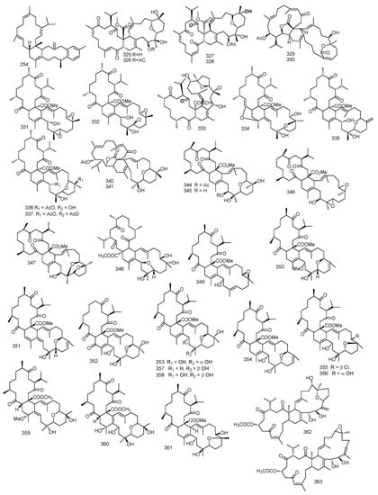 Sarcomililatols A, B and sarcomililate A 319–321, which possessed tricyclo [11.3.0.02,16] hexadecane skeleton, along with diterpenoids sarcophytol M 322, were isolated from S. mililatensis. Absolute configuration for sarcomililatol A 319 and sarcomililate A 321 were elucidated by combination of residual dipolar coupling-based NMR analysis, Snatzke’s assay and TDDFT-ECD calculation and anomalous X-ray diffraction with sarcomililatol A 319. The authors also proposed a biogenetic pathway relationship for sarcomililatols A, B and sarcomililate A 319–321. Based on structural resemblance between the three compounds, acetylation of sarcomililatol B 320 gave sarcomililatol A 319, and with dehydration under acid, isomerization and intramolecular [4 + 2] cycloaddition, sarcomililate A 321 was formed [100]. A pyrane-cembranoid diterpenes, 9-hydroxy-7,8dehydro-sarcotrocheliol and 8,9-expoy-sarcotrocheliol acetate 323 and 324 were isolated from S. trocheliophorum [101]. Figure 4 summarizes diterpenes isolated from Sacrophyton sp.