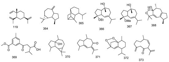 Trocheliophorin 369 was isolated from S. trocheliophorum ethyl acetate extract. Through spectral data, its structure was elucidated, revealing that it could be the result of aromatization with dehydration of ring B of sarcophytin which co-exist in the extract, and removal of ring C and the ring junction methyl and breakage of ring A [112]. In addition, aromadendrene sesquiterpenoid, palustrol 370 from S. trocheliophorum was reported [77]. Moreover, sesquiterpene guajacophine 371 and 1,4-peroxymuurol-5-ene 372 from S. ehrenbergi were stated. [62]. Continuing the abovementioned isolation from S. glaucum sesquiterpenoid, 6-oxo-germacra-4(15),8,11-triene 373 was also reported [78]. Figure 6 summarizes sesquiterpenes isolated from Sacrophyton sp.