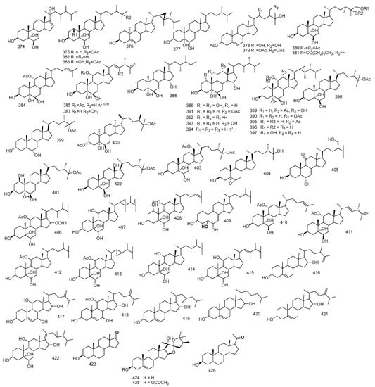 Beside the abovementioned isoprenoids obtained from S. glaucum, 16-deacetylhalicrasterol B 422, together with sarcoaldesterol B 396, sarglaucsterol 423 were isolated too and their structures were elucidated by spectral data [70]. Furthermore, from S. ehrenbergi the isolation of two formerly isolated hippurine 424 and 425 [120] alongside pregnenolone 426 were reported [121]. Figure 7 summarizes polyhydroxylated sterols isolated from Sacrophyton sp.