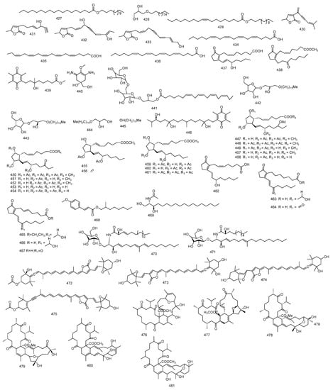 From S. trocheliophorum, tetradecyl octadecenoate 427, 2,3-dihydroxypropyloctadecyl ether 428 and tetradecyl-9-Z-octadecenoate 429 were identified [29]. In addition, purification of the total lipid extract of S. trocheliophorum provided four butenolides 430–433 with different chain substitutions and saturation together with three fatty acids, arachidonic acid, eicosapentaenoic and docosahexaenoic methyl esters 434–436 and prostaglandin PGB2 437 [122].