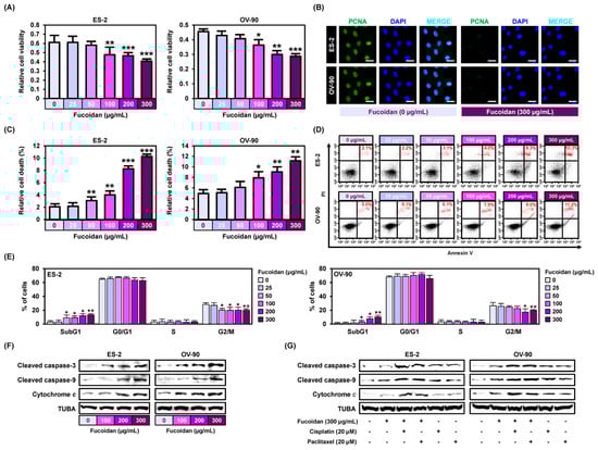 Fucoidan leads to cell death in ES-2 and OV-90 cells. (A) Observation of cell growth shows that fucoidan inhibits ES-2 and OV-90 cell growth. (B) Immunofluorescence observation of PCNA in ES-2 and OV-90 cell lines. Detection of PCNA in the nucleus of ES-2 and OV-90 cell lines was decreased by fucoidan. Scale bar indicates 40 µm. (C,D) Fucoidan-induced apoptosis of ES-2 and OV-90 cells. Fucoidan induced late apoptosis phase (red color) ES-2 and OV-90 cells concentration dependently (0, 25, 50, 100, 200, and 300 μg/mL) using a flow cytometry. (E) Population of the cells within each cell cycle progression was observed through flow cytometry after staining the fucoidan-treated ES-2 and OV-90 cells using PI dye. (F) Effects of fucoidan on the activation of apoptotic signals in ES-2 and OV-90 cells. (G) Effects of fucoidan with cisplatin or paclitaxel on the activation of the apoptotic proteins in human ovarian cancer cell lines. *** p < 0.001, ** p < 0.01, and * p < 0.05 indicate significant differences.