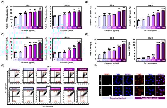 Induction of reactive oxygen species (ROS) production, calcium ion regulation, and mitochondrial membrane permeabilization by fucoidan. (A) ROS generation by fucoidan was estimated through dichlorofluorescein (DCF) fluorescence intensity using flow cytometry. (B) Flow cytometric observation of cytosolic Ca2+ in response to 48 h incubation with dose dependent fucoidan by staining ES-2 and OV-90 cells with Fluo-4. (C) Flow cytometric observation of mitochondrial Ca2+ concentrations in ES-2 and OV-90 cells in response to fucoidan by staining with Rhod-2. (D,E) Flow cytometric observation of mitochondrial membrane potential (MMP) in ES-2 and OV-90 cells treated with fucoidan by staining with JC-1 dye. Loss of MMP was estimated through JC-1 red and green fluorescence ratios. (F) Terminal deoxynucleotidyl transferase dNTP nick end labeling (TUNEL) detected apoptosis (red) and the cells were counter-stained with DAPI (blue) in ES-2 and OV-90 cells. Scale bar indicates 40 µm. *** p < 0.001, ** p < 0.01, and * p < 0.05 indicate significant difference.