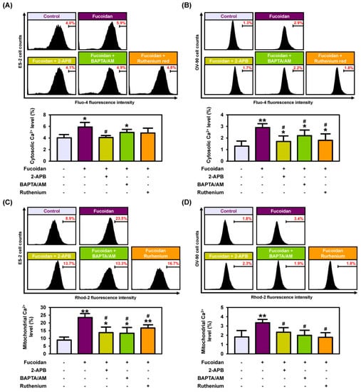 ES-2 and OV-90 cell lines were incubated on 6-well plates for 24 h in no-FBS medium. The cells were incubated with fucoidan (0, 25, 50, 100, 200, and 300 μg/mL) or co-treatment of fucoidan (300 μg/mL) and calcium chelators including 2-aminoethoxydiphenyl borate (2-APB; D9754, Sigma-Aldrich, St. Louis, MO, USA), 1,2-bis(2-aminophenoxy)ethane-N,N,N′,N′-tetraacetic acid tetrakis (acetoxymethyl ester; BAPTA/AM; sc-202488, Santa Cruz Biotechnology, Dallas, TX, USA), or ruthenium red for 48 h at 37 °C and 5% CO2. The cells were collected through 0.25% trypsin-EDTA and washed through medium before staining with 3 μM Fluo-4 acetoxymethyl (AM) ester (Invitrogen, Carlsbad, CA, USA) at 37 °C and 5% CO2 for 20 min. Fluorescent intensity was observed through Guava easyCyte™ 5 Flow Cytometer (Merck Millipore, Burlington, MA, USA). The experiment was repeated three times.