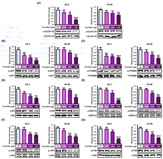Repression of cyclin D1, PI3K, and MAPK pathways by fucoidan. (A–G) Western blotting indicated (A) phosphorylated (p)-cyclin D1, (B) p-AKT, (C) p-P70S6K, (D) p-S6, (E) p-ERK1/2, (F) p-JNK, and (G) p-P38 proteins in fucoidan (0, 100, 200, and 300 μg/mL)-treated ES-2 and OV-90 cells. The values of graph were calculated compared with vehicle-treated cells. *** p < 0.001, ** p < 0.01, and * p < 0.05 shows significances.