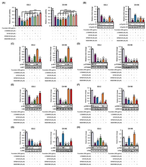 Inhibition of intracellular signals on cell growth and phosphorylation of target proteins in ovarian cancer cell. (A) The growth of ES-2 and OV-90 cells was observed by treatment of fucoidan (300 μg/mL) or a combination of fucoidan with LY294002 (blockage of AKT), U0126 (blockage of ERK1/2), SB203580 (blockage of P38), or SP600125 (blockage of JNK) for 48 h. (B–H) Repression of inhibitors on the activation of (B) p-cyclin D1, (C) p-AKT, (D) p-P70S6K, (E) p-S6, (F) p-ERK1/2, (G) p-JNK, and (H) p-P38 in both ES-2 and OV-90 cells. The values of graph were calculated compared with vehicle-treated cells. *** p < 0.001, ** p < 0.01, and * p < 0.05 indicate significant effects of each treatment compared with vehicle-treated control cells. # indicates significant effects (p < 0.05) as compared to fucoidan alone.