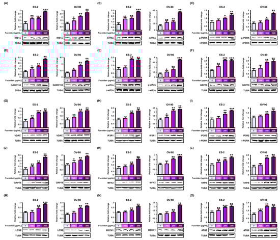 Stimulation of endoplasmic reticulum (ER) stress sensor, ER–mitochondria tethering proteins, and autophagy regulators by fucoidan in ES-2 and OV-90 cells. (A–F) The stimulation of ER stress sensor proteins, (A) IRE1α, (B) ATF6α, (C) p-PERK, (D) GADD153, (E) p-eIF2α, and (F) GRP78 was observed through western blot analysis in ES-2 and OV-90 cell lines incubated with fucoidan. (G–L) The activation of ER-mitochondria axis-associated proteins, (G) VDAC, (H) IP3R1, (I) IP3R2, (J) GRP75, (K) MFN2, and (L) VAPB was analyzed by western blotting in fucoidan treated ES-2 and OV-90 cells. (M–O) The activation of autophagy-associated proteins, (M) LC3B, (N) BECN1, and (O) ATG5 was observed through western blot in ES-2 and OV-90 cells incubated with fucoidan. The graph of the signals was calculated compared with total signal or α tubulin (TUBA). *** p < 0.001, ** p < 0.01, and * p < 0.05 show significances.