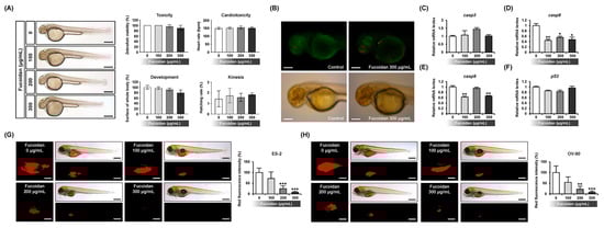 Effects of fucoidan on normal and xenograft zebrafish in vivo. (A) Toxicological analysis of fucoidan (0, 100, 200, and 300 μg/mL) was performed using fucoidan-exposed zebrafish larvae for 48 h to evaluate toxicity, cardiotoxicity, development, and kinesis in vivo. Scale bar indicates 250 µm. (B) Apoptotic effects of fucoidan on zebrafish larvae was analyzed using acridine orange to detect apoptotic cells after 48 h incubation. (C–F) Expression of apoptosis-related genes was estimated in fucoidan-treated zebrafish larvae for 48 h by quantitative RT-PCR. The scale bar indicates 50 µm. (G,F) In zebrafish xenograft model generated with microinjection of ES-2 (G) and OV-90 (H) cells, pre-treated fucoidan gradually inhibited tumor formation leading to a decrease in tumor size in vivo. The scale bar reveals 25 μm in square panels and 100 μm in rectangle panels. *** p < 0.001, ** p < 0.01, and * p < 0.05 indicate significant effects of fucoidan.