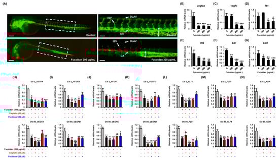 To identify if fucoidan has anti-angiogenic effects, we used the zebrafish Tg(fli1:eGFP) line generated for the study of vascular system. Treatment with fucoidan (300 μg/mL) disrupted the vascular development of zebrafish embryo, especially dorsal longitudinal anastomotic vessel (DLAV), intersegmental vessel (ISV), and dorsal aorta (DA) parts compared with vehicle-treated fli1 Tg models (Figure 8A). In accordance with the results, the angiogenesis-related genes such as vascular endothelial growth factor Aa (vegfaa), vegfc, fms related tyrosine kinase 1 (flt1), flt4, kinase insert domain receptor (kdr), and kdr like (kdrl) were dramatically decreased in fucoidan-incubated fli1 Tg zebrafish compared with the control (Figure 8B–G). Next, we compared the anti-angiogenic effects of fucoidan with conventional anti-cancer drugs including cisplatin and paclitaxel in human ovarian cancer cell lines. The mRNA expression of VEGFs (VEGFA-VEGFD) was reduced by fucoidan in ES-2 and OV-90 cells (Figure 8H–K). Their expression was synergistically decreased by a combination of fucoidan with cisplatin or paclitaxel compared with individual treatment. Even though the synergy of fucoidan with cisplatin or paclitaxel on FLT1 expression was indicated only in ES-2 cells, mRNA expression of FLT4 and KDR was highly inhibited in ES-2 and OV-90 cells incubated with the combined treatment compared with those incubated with the individual treatments (Figure 8L–N).