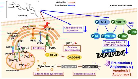 Fucoidan caused a 40% growth inhibition in ES-2 and OV-90 cells at a dose of 300 µg/mL, and it induced the apoptosis in ovarian cancer cells after 48 h incubation. Additionally, fucoidan triggered the depolarization of MMP, production of ROS, and an increase in calcium ion concentration in cytosol and mitochondria. Fucoidan inhibited PI3K/MAPK intracellular signal pathways; however, it activated the apoptotic cascades and ER stress sensor proteins in the ovarian cancer cells as illustrated in Figure 9. Although fucoidan did not affect the normal zebrafish in vivo, it highly decreased tumor formation and angiogenesis in the xenograft and fli1 Tg models, respectively. Additionally, fucoidan suppressed the expression of angiogenesis-related genes in vivo and in vitro by enhancing the efficiency of chemotherapeutic agents. These data indicate that fucoidan can be used as a novel drug for the management and treatment of ovarian cancer.