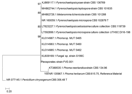 The endophytic fungus FVE-001 was isolated from the thallus of Fucus vesiculosus collected at Kiel Fjord (Baltic Sea, Germany) [12]. The initial Sanger sequencing of the PCR-amplified ITS1-5.8S rRNA gene-ITS2 region yielded a total length of 297 bp fragment, which only enabled its identification at order level, i.e., Pleosporales [12]. In order to further confirm the taxonomic identity of the fungus, the same genomic DNA extract was re-amplified and sequenced for ITS1-5.8S-ITS2 genes to yield a 394 bp length PCR fragment. The sequence result was subjected to NCBI Blast analysis that showed 100% sequence similarity to Phoma sp. and 99% sequence similarity to closely related strain, Pyrenochaetopsis microspore. In order to further validate the taxonomy of the fungus FVE-001, a phylogenetic tree was constructed with 14 related strains from the NCBI database. As shown in Figure 1, the phylogenetic tree suggested the fungus FVE-001 to be closely related to Phoma sp. However, in the phylogenetic tree, FVE-001 did not cluster with the typical Phoma sp., i.e., Phoma neerlandica and Phoma herbarum. Further investigation revealed that the closely related Phoma strains MUT 5460, MUT 5462 and MUT 5465 (Figure 1) have now been reclassified as Pyrenochaetopsis leptospora in the UNITE database (https://unite.ut.ee/sh/SH1525086.08FU#fndtn-panel1) [16]. This confirmed that the fungus FVE-001 to be a Pyrenochaetopsis sp.
