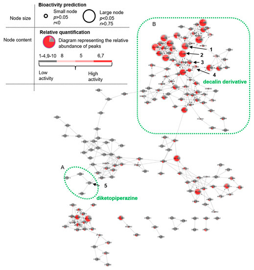 Bioactivity-based molecular networking of SPE fractions obtained from chloroform subextract of Pyrenochaetopsis sp. FVE-001. (A) Subcluster of diketopiperazine chemical family detected in MN. (B) Subcluster of decalin family detected in MN. 1–4: Decalinoyltetramic acid derivatives, 5: known diketopiperazine cyclo-(leu-pro).