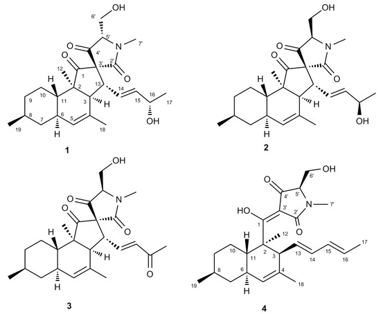 - Zhao, D.; Han, X.; Wang, D.; Liu, M.; Gou, J.; Peng, Y.; Liu, J.; Li, Y.; Cao, F.; Zhang, C. Bioactive 3-decalinoyltetramic acids derivatives from a marine-derived strain of the fungus Fusarium equiseti D39. Front. Microbiol. 2019, 10, 1285–1294. [Google Scholar] [CrossRef]