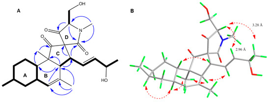 Compound 1 was isolated as a colorless oil. HR-ESIMS spectrum of 1 contained a molecular ion peak at m/z 430.2592 [M + H]+ consistent with the molecular formula C25H35NO5 requiring 9 degrees of unsaturation (Figure S7). The FT-IR spectrum implied the presence of hydroxyl and carbonyl groups (3249–3554, 1683 and 1721 cm−1, respectively) (Figure S8). The 13C-NMR data (Table 2, Figure S2) comprised 25 carbon signals, including four olefinic carbons at δc 127.3, 128.1, 131.8 and 138.8 along with three carbonyl groups at δC 168.6, 207.2 and 213.3. The 1H NMR and DEPT-HSQC spectra of 1 (Table 1, Figures S1 and S3) contained signals corresponding to five methyl groups, of which two are secondary (δH 1.19, d, J = 6.4 Hz, H3-17; δH 0.90, d, J = 6.5 Hz, H3-19), one tertiary (δH 0.98, s, H3-12), one olefinic (δH 1.73, br s, H3-18) and one being an N-methyl (δH 3.10, s, H3-7′). The DEPT-HSQC spectrum also confirmed the presence of four diastereotopic methylene protons corresponding to H2-7 (δH 0.86 and 1.78), H2-9 (δH 1.01 and 1.72), H2-10 (δH 1.04 and 1.42) and the oxymethylene H2-6′ (δH 4.09, dd, J = 12.2, 2.6 Hz and δH 3.92, dd, J = 12.3, 4.8 Hz). Further detected were ten complex methine protons, six of which appearing at δH 2.57 (H-3, d, J = 11.4 Hz), δH 1.43 (H-8, m), δH 1.82 (H-6, m), δH 1.63 (H-11, m), δH 3.44 (H-13, dd, J = 11.4, 8.6 Hz) and δH 3.57 (H-5′, dd, J = 4.8, 2.6 Hz). The seventh (oxy) methine proton appeared at δH 4.24 (H-16, m). The remaining three methine protons were olefinic; two appeared as part of an AB system at δH 5.75 (H-14, dd, J = 15.4, 8.6 Hz) and δH 5.71 (H-15, dd J = 15.4, 4.8 Hz), while the final olefinic methine (H-5) emerged as a broad singlet at δH 5.24 (Figure S1). The 1H-1H COSY spectrum of 1 (Figure S4) led to the establishment of three spin systems. As shown in Figure 4A, the shortest spin system belonged to a hydroxyethyl group including H-5′ and H-6′, while the second spin system was represented by a 16-hydroxypentenyl group (H-13 to H3-17). The largest and third COSY spin network corresponded to a substituted methylcyclohexane moiety, starting with the secondary methyl H3-19 and ending with the olefinic H-5 (Figure 4A and Figure S4). Diagnostic HMBC correlations (Figure 4A and Figure S5) observed from H-3 to C-2, C-4, C-11; from H-5 to C-3, C-7 and C-11; from H-7 to C-5, C-8 and C-9 and from H-11 to C-2, C-6, C-7, C-9 and C-10 permitted the establishment of the bicyclic partial structure, i.e., the unsaturated decalin moiety (rings A-B, Figure 4A). The olefinic methyl H3-18 was assigned to C-4 based on the substantial HMBC cross peaks seen from H3-18 to C-4, C-5 and C-3. The secondary methyl H3-19 was already placed at C-8 by COSY data and HMBC cross-peaks from H3-19 to C-7, C-8 and C-9 further confirmed its assignment. The tertiary methyl H3-12 had to be attached at C-2 on the basis of multiple HMBC correlations of H3-12 with C-1, C-2, C-3 and C-11. Additional correlations, i.e., COSY (between H-3 and H-13, H-13 and H-14) and HMBC (between H-3 with C-13, C-14 and C-15), confirmed the attachment of the 16-hydroxypentenyl side chain at C-3 of the decalin ring (Figure 4A, Figures S4 and S5). Further HMBC correlations from H-5′ to C-2′, C-4′ and from H3-7′ to C-2′and C-5′ established the terminal N-methyl tetramic acid structure (ring D) (Figure 4A and Figure S5). The long-range (HMBC) couplings detected between H-13/C-3′ and H-13/C-2′ confirmed the connectivity of tetramic acid ring to decalin moiety through a spiro carbon, C-3′ (Figure 4A and Figure S5). A key long range coupling between H3-12/C-1 and H3-12/C-2 and H-3/C-12 clearly assigned the carbonyl group (δc 213.3) at C-1. This completed the final ring system, C (Figure 4A).