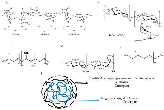 Chemical structure of alginate (a) reproduced with permission from Pan et al., Minerals; published by MDPI, 2019 [30], dextran sulfate (b) reproduced with permission from Quiñones J.P.; Peniche H. and Peniche C; published by MDPI, 2018 [31], poloxamer 188 (c) reproduced with permission from Radacsi et al., Crystal Growth & Design, 2012 [32], chitosan (d) reproduced with permission from Quiñones J.P.; Peniche H. and Peniche C; published by MDPI, 2018 [31], and polyethylene glycol 4000 (e) reproduced with permission from Zia et al., Algae Based Polymers, Blends, and Composites;published by Elsevier, 2017 [33]. The ideal structure of the nanocomposites is also plotted (f).