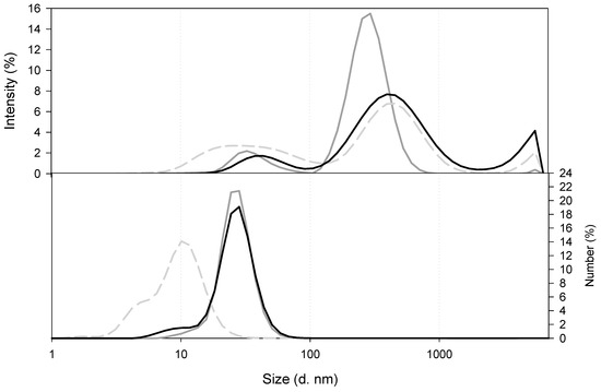 Before paying attention to the actual nanocomposites it is important to have information about chitosan solutions. As can be seen in Figure 2, the size distribution for low MW (LMW) CS at 10−5 g/mL (dark grey solid line) revealed the presence of two populations, one of them located in 10 s of nanometres of diameter and the second one around a few 100 s of nanometres in hydrodinamic diameter. However, at a higher concentration, namely, 7 × 10−4 g/mL, LMW CS (grey dashed line) the populations were enlarged and became larger than one micron. A third population was enlarged around 1000 s of nanometres, although this population was negligible in the size distribution by number. It is important to point out that the size by intensity distribution of LMW CS 7 × 10−4 g/mL was quite similar to that of the medium MW (MMW) CS at 10−5 g/mL (black solid line). Despite the great differences in the size distribution of LMW CS and MMW CS at 10−5 g/mL, both of them had the same moles of amine groups per molecular weight (Table 2). In this work, we used LMW and MMW CS in two different concentrations, namely, 1 × 10−5 g/mL and 1 × 10−7 g/mL, for preparing nanocomposites, although nanocomposites prepared with LMW CS solution at 7 × 10−4 g/mL were used as a reference. Because the volumes of polymer solutions were not changed, the CS content in the nanocomposites was 70 or 7000 times less in nanocomposites prepared with CS solutions at 1 × 10−5 g/mL and 1 × 10−7 g/mL, respectively.