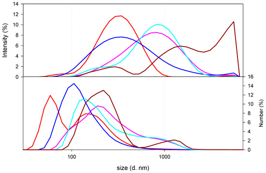 Size of nanocomposites as a function of the type and amount of CS. Nanocomposites prepared with LMW CS solutions at 7 × 10−4 g/mL (dark red line), 10−5 g/mL (red solid line), or 10−7 g/mL (pink line), or MMW CS solutions at 10−5 g/mL (blue line) or 10−7 g/mL (light blue line) were plotted.