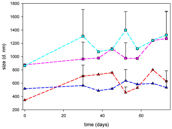 Evolution of the hydrodynamic diameter of nanocomposites after synthesis. Nanocomposites prepared with LMW CS solutions at 10−5 g/mL (red line) or 10−7 g/mL (pink line) or MMW CS solutions at 10−5 g/mL (blue line) or 10−7 g/mL (light blue line) were plotted.