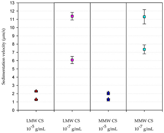 Thus, Equations (2)–(4) fit well with our experimental results in which the migration velocity of the nanocomposites prepared with CS solution at 10−7 g/mL was 10-fold the velocity of those prepared with CS solution of 10−5 g/mL. Moreover, it can be assumed that nanocomposite suspensions prepared with CS solution at 10−7 g/mL became more heterogeneous after the centrifugation, as can be observed from the difference in the migration velocities of the particles present in the suspension, revealing the presence of populations of nanocomposites showing different hydrodynamic radii. This result revealed that the nanocomposites prepared with CS solutions at 10−7 g/mL were indeed more instable.