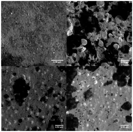 Scanning electron microscope images of nanocomposites prepared with LMW CS solutions at 10−5 g/mL (upper left) or at 10−7 g/mL (upper right), or MMW CS solutions at 10−5 g/mL (lower left) or at 10−7 g/mL (lower right). All images were made at a magnification of 2000×. The scale bars in the images represent 4.52 µm.