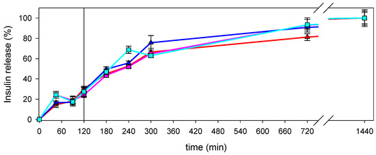 Insulin release under physiological conditions was performed by dialyzing nanocomposite suspensions in SGF for 2 h, which resulted in the release of 30.4% and 24.2% in the case of nanocomposites prepared with LMW CS solutions at 10−5 g/mL and 10−7 g/mL, respectively, and 28.3% and 27.4% in the case of nanocomposites prepared with MMW CS solutions at 10−5 g/mL and 10−7 g/mL, respectively. Then, the nanocomposites were transferred into SIF up to 24 h. The cumulative insulin release fitted well with the total amount of insulin used for the formulations (Figure 7).