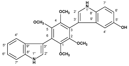 - Buttachon, S.; Ramos, A.; Inácio, Â.; Dethoup, T.; Gales, L.; Lee, M.; Costa, P.; Silva, A.; Sekeroglu, N.; Rocha, E.; et al. Bis-Indolyl benzenoids, Hydroxypyrrolidine derivatives and other constituents from cultures of the marine sponge-associated fungus Aspergillus candidus KUFA0062. Mar. Drug. 2018, 16, 119. [Google Scholar] [CrossRef]