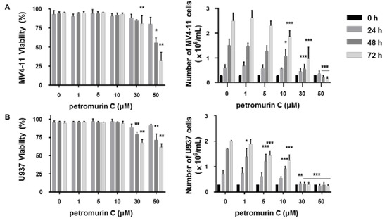 FLT3-ITD-mutated MV4-11 and FLT3 wild-type (WT) U937 cells were treated with increasing concentrations of petromurin C for up to 72 h. Petromurin C reduced proliferation and viability of MV4-11 and U937 AML cell lines (Figure 2A,B) as shown by trypan blue staining assays. The concentrations that reduced 50% of viability and proliferation are shown in Table 2.