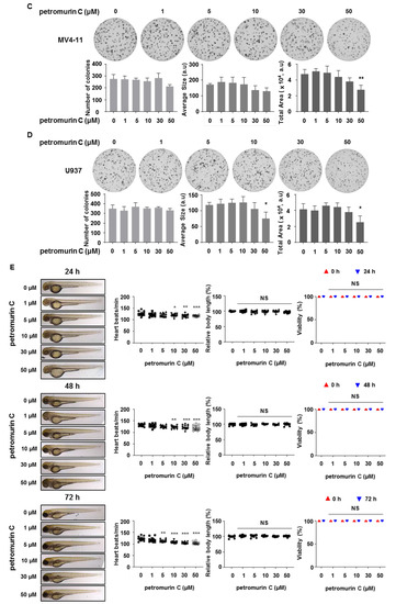 We confirmed our results by colony formation assays (CFA) that showed a significant decrease of total colony areas at 50 μM in MV4-11 cells and at 50 μM in U937 cells (Figure 2C,D). To evaluate the in vivo toxicity of petromurin C, heart rate, body length, and viability of zebrafish embryos were analyzed after exposure to increasing concentrations of petromurin C. Although a heart rate of zebrafish decreased in a dose-dependent manner, there were no significant changes of viability and morphology of the zebrafish (Figure 2E).