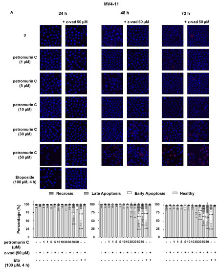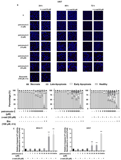 Type and characteristics of cell death induced by petromurin C were investigated by Hoechst/PI staining assays in AML cell lines. Nuclear condensation and fragmentation, which are characteristics of apoptotic cell death, were observed. Petromurin C significantly induced 41.7% of cell death at 50 μM after 24 h in MV4-11 cells, whereas lower concentrations did not affect viability at 24 h. zVAD-FMK (50 μM), which is a pan-caspase inhibitor, prevented apoptotic cell death in both cell lines at 24 h (Figure 3A,B). Similarly, petromurin C induced a 6.6-fold increase of caspase 3/7 activation at 50 μM in MV4-11 cells. We observed a 2.5-fold and 2.6-fold increase of caspase 3/7 activation at 30 and 50 μM in U937 cells. zVAD-FMK pretreatment inhibited caspase 3/7 activity in both cell lines at 24 h (Figure 3C). At later time points, zVAD-FMK pretreatment did not efficiently abrogate cell death in MV4-11 and U937 cell lines since 58.2% of cell death was induced by petromurin C at 50 μM in MV4-11 cells compared to 45.7% of cell death being induced by zVAD-FMK pretreatment at 48 h (Figure 3A,B), which allows us to hypothesize that other caspase-independent, cell death modalities are also induced by petromurin C, which is compatible with an irreversible mitochondrial commitment to death.
