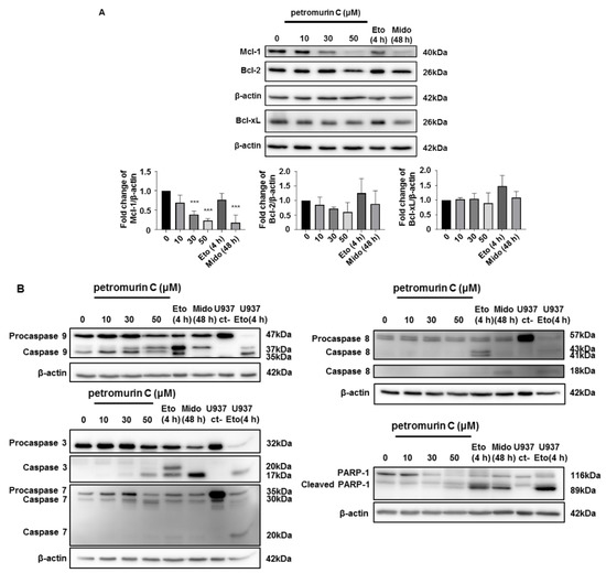 To study apoptotic cell death mechanisms induced by petromurin C, expression levels of apoptotic and anti-apoptotic proteins including Bcl-2, Bcl-xL (B-cell lymphoma-extra-large), and Mcl-1 (myeloid cell leukemia-1) were assessed in MV4-11 cells [13]. As shown in Figure 4A, Bcl-2 and Bcl-xL expression levels remained unchanged while levels of Mcl-1 were decreased by 61.4% and 77.1% at 30 and 50 µM, respectively, at 24 h in MV4-11 cells (Figure 4A).
