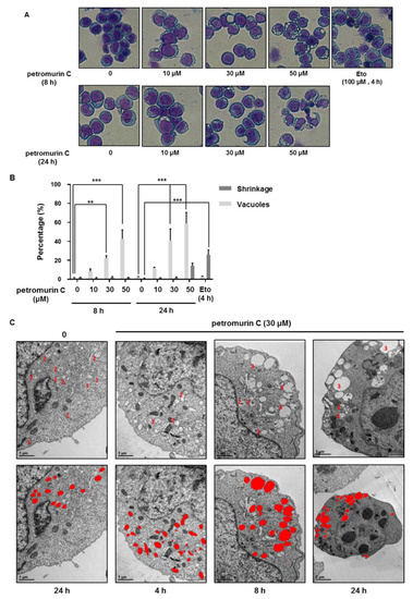 As we observed morphological changes in petromurin C-treated MV4-11 cells, we used Diff-Quik staining to visualize dose-dependent and time-dependent effects of petromurin C on MV4-11 cells. Extensive formation of cytoplasmic vesicles was observed starting at 10 μM, 8 h (Figure 5A). In addition, 8.3%, 22.1%, and 42.6% of cytoplasmic vesicles formed after 8 h at 10, 30, and 50 μM, respectively. At 24 h, 11.9%, 41.0%, and 58.9% of cytoplasmic vesicles formed at 10, 30, and 50 μM of petromurin C, respectively. In addition, 14.2% of pyknotic cells were observed at 50 μM after 24 h (Figure 5B).