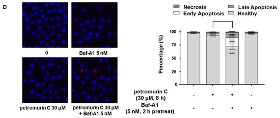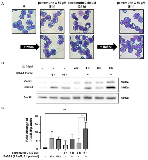 In order to further assess the nature of the cytoplasmic vesicles observed in petromurin C-treated-MV4-11 cells, we co-treated our cells with caspase and autophagy inhibitors prior to Diff-Quik staining. Pan-caspase inhibitor, zVAD-FMK (50 µM, 1 h-pretreatment), did not prevent the formation of cytoplasmic vesicles at the highest concentration at 8 h. However, the autophagy inhibitor, bafilomycin A1 (Baf-A1, 5 nM, 2 h-pretreatment) significantly inhibited the formation of vesicles in the cytoplasm (Figure 6A). To validate the involvement of petromurin C in autophagy induction, we pretreated MV4-11 cells with 2.5 nM of Baf-A1 prior to treatment with petromurin C at 30 µM at different time points. The autophagy induction marker LC3B was quantified after immunoblotting. LC3B I-II conversion time-dependently increased by 6.2-fold and 12.4-fold for 6 and 10 h with a 2-h pretreatment of Baf-A1, respectively (Figure 6C), whereas p62 expression levels did not significantly change (Figure S2). To test which mode of autophagy petromurin C caused, we used Hoechst/PI staining of petromurin C-treated MV4-11 cells with or without Baf-A1 pretreatment. The results showed that 28.1% of cell death was observed in petromurin C-treated MV4-11 cells with a pretreatment of Baf-A1 compared to 7.3% of cell death in only petromurin C-treated MV4-11 cells (Figure 6D). According to the results, we concluded that Baf-A1 inhibited the formation of autophagy and significantly potentialized petromurin C-induced cell death at early time points.