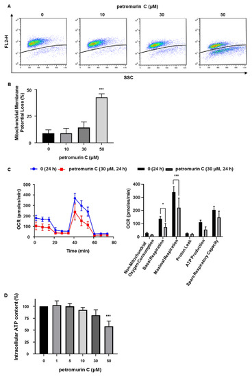 Next, to investigate mitochondrial stress caused by petromurin C treatment, we evaluated the oxygen consumption rate (OCR) (Figure 7C). In response to petromurin C treatment, we observed decreases of non-mitochondrial oxygen consumption (1.9-fold), basal respiration (1.9-fold), maximal respiration (1.5-fold), proton leak (1.4-fold), ATP production (2.0-fold), and spare respiratory capacity (1.4-fold) (Figure 7D). The initial OCR level of petromurin C-treated MV4-11 cells was lower than that of control cells, which indicated a decline of total mitochondrial mass. Oligomycin, an ATP synthase inhibitor, notably reduced ATP-linked respiration in control MV4-11. Maximal respiration of both control and petromurin C-treated MV4-11 cells increased after injection of the mitochondrial uncoupler FCCP (Figure 7C). However, the maximal respiration rate decreased in petromurin C-treated MV4-11 cells by 45.4% when compared to control cells (Figure 7D). The intracellular ATP levels of cells treated with petromurin C decreased dose-dependently and significantly at 50 µM (Figure 7E). Altogether, these results are in line with the loss of mitochondrial membrane potential.