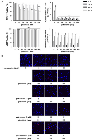 Since gilteritinib (ASP2215), which is a dual inhibitor of FLT3/AXL, has been clinically studied in combination treatments, we attempted to combine it with petromurin C. Viability and proliferation assays with gilteritinib were first quantified in U937 and MV4-11 cells. Results showed that gilteritinib specifically targets FLT3-ITD-mutated MV4-11 cells while this compound has no effect on viability and proliferation of U937 cells expressing wild-type FLT3 (Figure 8A). In the next step, the cell death modality induced by gilteritinib was characterized and quantified by fluorescence microscopy after Hoechst/PI staining in MV4-11 cells. Since the pan-caspase inhibitor zVAD-FMK (50 μM) reduced the percentage of cell death induced by gilteritinib (Figure S3A,B), we concluded that caspase-dependent apoptosis was induced.