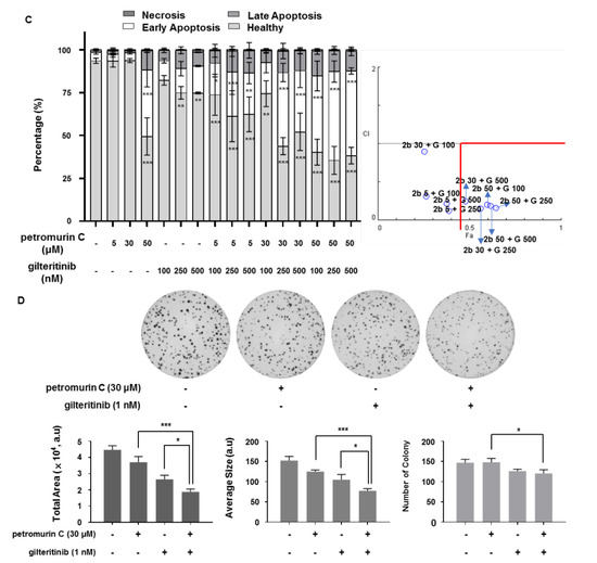 In addition, reduced levels of Mcl-1, loss of MMP, and mitochondrial dysfunction caused by petromurin C might contribute to the synergistic combination effect. Combination of gilteritinib and cytarabine (AraC), daunorubicin (DNR), idarubicin (IDR), or azacytidine (Aza) triggered inhibition of tumor growth and increased sensitivity to antitumor activity [11]. A combination treatment of gilteritinib with chemotherapy showed more efficacy compared to chemotherapy or gilteritinib alone in FLT3-ITD-mutated cell lines [11]. These results indicate that this combination treatment can be beneficial to patients who are not responding to gilteritinib when used alone.