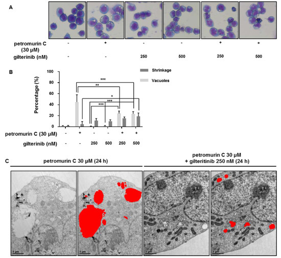 Next, we used Diff-Quik staining (Figure 9A) and TEM images (Figure 9C) of MV4-11 cells treated with a combination of petromurin C and gilteritinib at 24 h to visualize morphology of the cells. Our results showed cell shrinkage (apoptotic volume decrease, AVD) and induction of vesicle-formation after combination treatment. Furthermore, 30 µM of petromurin C alone led to 44.9% of MV4-11 cells that formed vacuoles with 4.4% of cells undergoing AVD. On the other hand, 24.2% of vacuole-forming cells and 15.2% of AVD were observed after a combination treatment of 30 µM of petromurin C and 250 nM of gilteritinib. Additionally, 23.3% of vacuole-forming cells and 18.7% of AVD were observed after a combination of 30 µM of petromurin C and 500 nM of gilteritinib in MV4-11 cells (Figure 9B). We observed that a combination of petromurin C and gilteritinib induced a decrease of vacuole formation while it increased AVD of the cells.