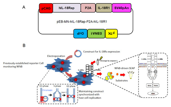 Design of construct stably and simultaneously expressing two cognate human IL-18 receptor subunits. (A) The structures of a novel constructs, pEB-MN-hIL-18Rap-P2A-hIL-18R1. (B) Schematic figure indicates procedures of electroporation to introduce the construct into the previously established NFkB reporter cells and maintaining the constructs synchronized with host cell replication and stably expressing both human IL-18R accessory protein and IL-18 receptor 1 in order to detect specifically IL-18-induced NFkB.