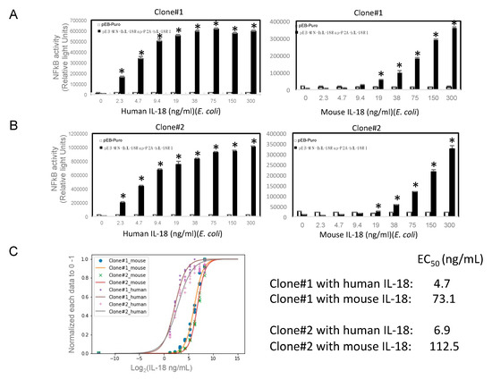 We next tried to examine whether or not there are differences of responsiveness between human and mouse recombinant IL-18 in the cells. We treated various concentrations of human or mouse recombinant IL-18 ranging from 2.3 to 300 ng/mL to the cells and then, determined NFkB activity. We could observe the concentration-dependency of human (Figure 3A and B left) and mouse (Figure 3A and B right) IL-18-induced NFkB activation. Any activation of NFkB could not be occurred in the parental cells treated with human or mouse IL-18 (Figure 3A,B). However, to a lesser extent, mouse IL-18 activates NFkB in the novel reporter cells (Figure 3A and B right). Thus, we tried to calculate half maximal of effectiveness in mouse or human IL-18 treatment. Our curve fit analysis indicated that EC50 of human IL-18 in two independent experiments were 4.7 and 6.9 ng/mL, while those of mouse were 73.1 and 112.5 ng/mL (Figure 3C).