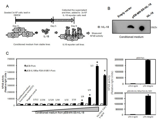 The cells as previously established [4,14], which are stably expressing and secreting SEAP and human IL-18, were cultured in DMEM (Invitrogen, CA, USA) containing 10% FBS at 37 °C with 5% CO2. Then, we introduced pEB-MN-hIL-18Rap-P2A-hIL-18R1 (10 µg) into 1 × 106 cells using NEPA21 Transfection Electroporation (NEPA Gene Co., Ltd., Chiba, Japan) as described previously [4,14]. In brief, the condition is 115V, pulse width: 2.5 ms (second), pulse interval: 50 ms, times: 2 and attenuation rate: 10% in poring pulse, and 20 V, pulse width: 50 ms, times: 5 and attenuation rate: 40% in transfer pulse. After that, the cells were cultured in DMEM containing 10% fetal bovine serum, puromycin (250 ng/mL) and G418 (25 µg/mL). To prepare conditioned culture medium from the cells stably secreting human recombinant IL-18 as previously reported [4], we seeded 3 × 105 cells onto 6-well plate in DMEM containing 10% FBS for 4 days and collected. The supernatant was serially diluted from 1/2 to 1/512 and then, incubated with the established reporter cells in this study.