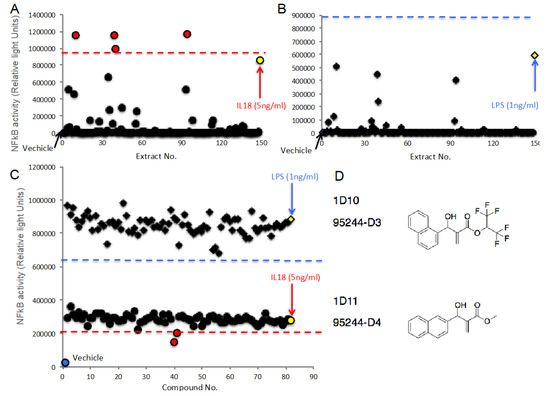 High-throughput screening in the novel reporter cells using natural product and synthetic compound libraries. The result of HTS in the novel reporter cells (Circle) (A) or the cells introduced with empty vector (Rhombus) (B) treated with 147 extracts derived from mainly marine bacteria (A). Yellow circle and rhombus indicate ligands such as 1 ng/mL IL-18- or 1 ng/mL LPS-induced NFkB activities, respectively (n = 8). Blue circle and rhombus indicate vehicle (0.5% DMSO). Dashed line indicates threshold as average of positive control, such as IL-18 (red) or LPS (blue), +6SD and then, identified four extracts (red circle). (C) The result of HTS in the novel reporter cells (red and lower part) or the parental cells introduced with empty vector (blue and upper part) treated with 80 of 240 synthetic compounds provided by Japanese chemists in the presence of 5 ng/mL IL-18- or 1 ng/mL LPS. Yellow circle and rhombus indicate only ligands such as 5 ng/mL IL-18- or 1 ng/mL LPS-induced NFkB activities, respectively (n = 8). Blue circle and rhombus indicate vehicle (0.5% DMSO). Dashed line indicates threshold as average of positive control, such as IL-18 (red) or LPS (blue), +6SD and identified two compounds (red circle). (D) Structures of identified two compounds.