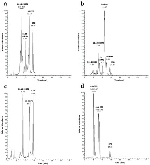 LC-MS analysis of the four benthic diatoms. Chromatographic profiles of (a) C. closterium, (b) N. shiloi, (c) C. scutellum and (d) Diploneis sp.; Internal standard: 16-hydroxy-hexadecanoic acid (STD). Abbreviations are in agreement with d’Ippolito et al. [34]. Structures are reported in Table S4 of the Supplementary Material.