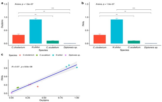 The spectrometric data of these compounds were not consistent with the structures of known oxylipins even if their chemical signature is in agreement with oxygenated derivatives of fatty acids. According to these data, statistical analysis showed significantly different levels of oxylipins in the four species (p-value < 0.001). In particular, N. shiloi was found to contain the highest level of LOX products among the four species, followed by C. closterium and C. scutellum (Figure 2a). As no canonical oxylipins were identified in Diploneis sp. by the LC-MS analysis, only trace amounts of LOX products are reported in this species.