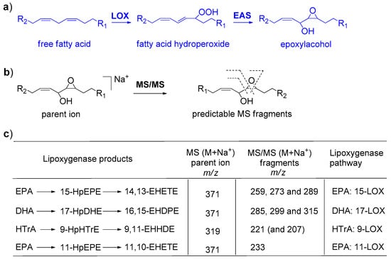 Identification of active lipoxygenases by MS/MS fragmentation of epoxyalcohols in C. closterium, N. shiloi and C. scutellum. For simplicity, the polyunsaturated chain of EPA is represented by the 1,3-pentadiene moiety that undergoes to enzymatic oxidation. R1 and R2 are variable alkyl residues to complement the structure of EPA (C20:5) or HTrA (C16:3). (a) Biosynthesis of fatty acids by LOX pathways; (b) MS parent ion and MS/MS fragmentation of epoxyalcohols analyzed as methyl esters in positive mode; (c) Diagnostic MS fragments used for the regiochemical identification of epoxyalcohols of diatoms. Assignments and abbreviations are in agreement with d’Ippolito et al. [34]. Structures are reported in Table S4 of the Supplementary Material.