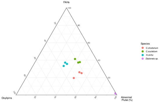 The quantities of FAHs and oxylipins measured through LC-MS analyses were correlated with biological assays of feeding experiments with the sea urchin P. lividus [31,32]. Specifically, the percentage of abnormal plutei deriving from adult sea urchins fed for one month with the four benthic diatoms (Supporting Material, Figure S2) were analyzed together with the amount of oxylipins and FAHs found in the present study. With the hypothesis that detrimental effect on plutei was dependent on LOX activities, a ternary diagram of the three parameters (normalized oxylipin concentration, normalized FAH concentration, percentage of abnormal plutei) clearly showed a good clusterization of the data according to the biological species (Figure 4).
