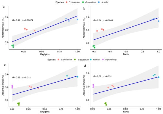 Correlation between feeding effect on the sea urchin Paracentrotus lividus and LOX products in the four benthic diatoms. (a,b) correlation of abnormal plutei with oxylipins and FAHs in the three species with active LOX pathways (C. closterium, N. shiloi and C. scutellum); (c,d) correlation of abnormal plutei with oxylipins and FAHs including Diploneis sp.
