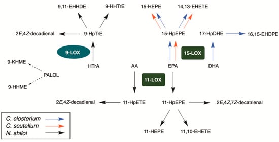 Lipoxygenase pathways and oxylipins of C. closterium, N. shiloi and C. scutellum (see abbreviation section for the name of the compounds). Abbreviations are in agreement with d’Ippolito et al. [34]. Structures are reported in Table S4 of the Supplementary Material.
