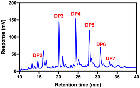 HPLC analysis of COS mixture with a charged aerosol detector. COS monomers with DPs in the range of 2–7. Their respective weight percentages were determined as follows: 3.69% ± 0.23% (DP2), 29.23% ± 0.40% (DP3), 30.81% ± 0.62% (DP4), 22.25% ± 0.35% (DP5), 11.64% ± 0.28% (DP6), and 2.37 ± 0.25% (DP7). Data were expressed as mean ± SEM.